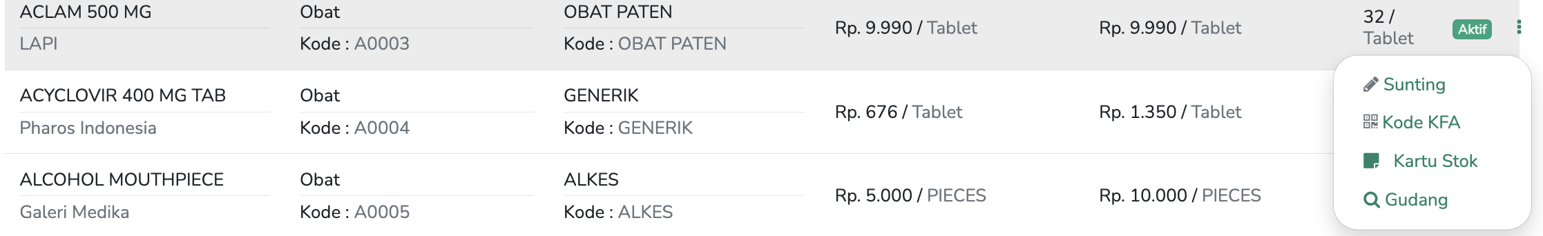 Setelah produk ditautkan dengan KFA, kode tersebut akan menjadi referensi utama. Anda hanya perlu menautkannya satu kali, dan sistem akan otomatis menggunakan kode itu di seluruh transaksi Farmasi.