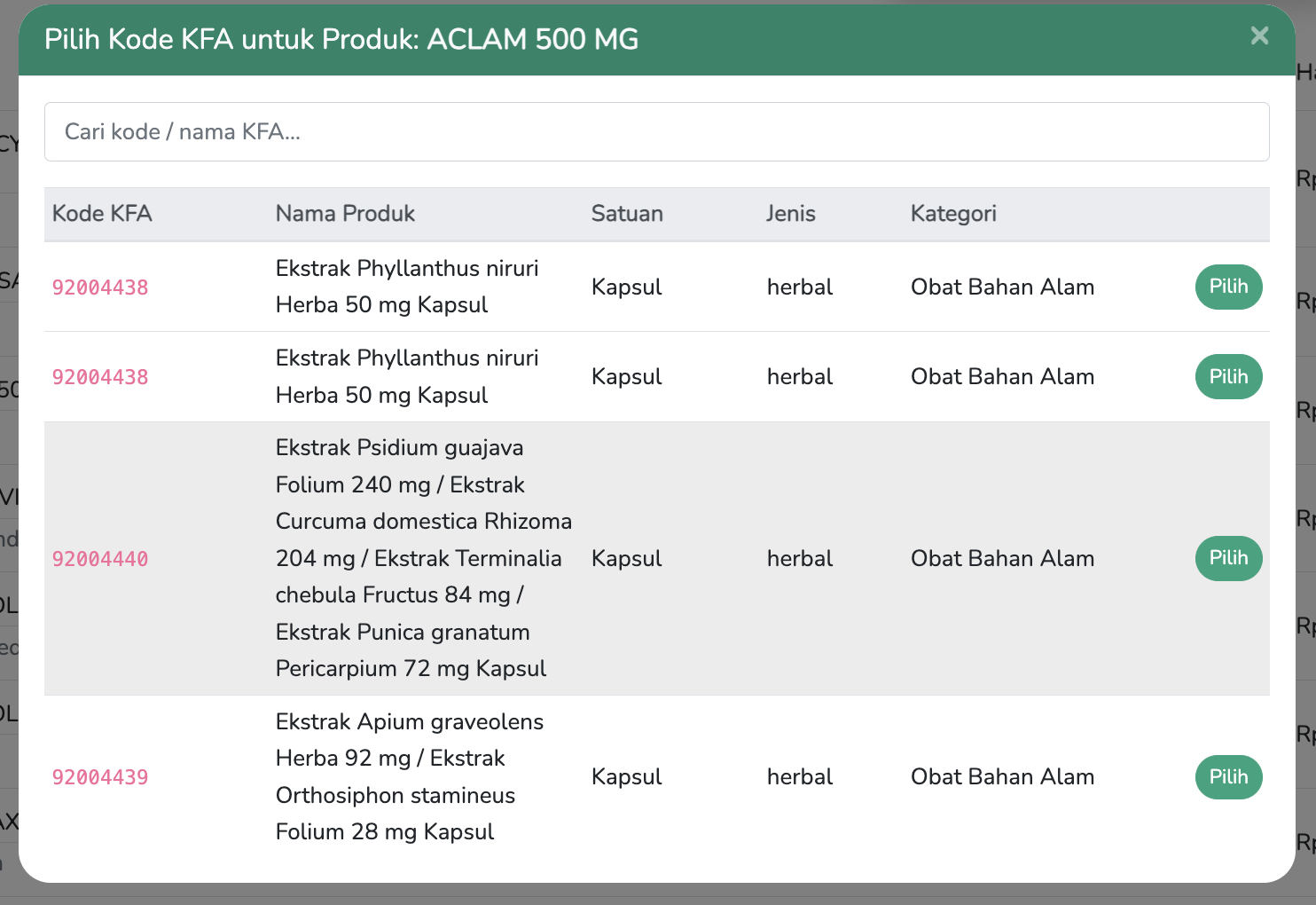 Pilih produk dari daftar KFA yang sesuai dengan obat Anda.