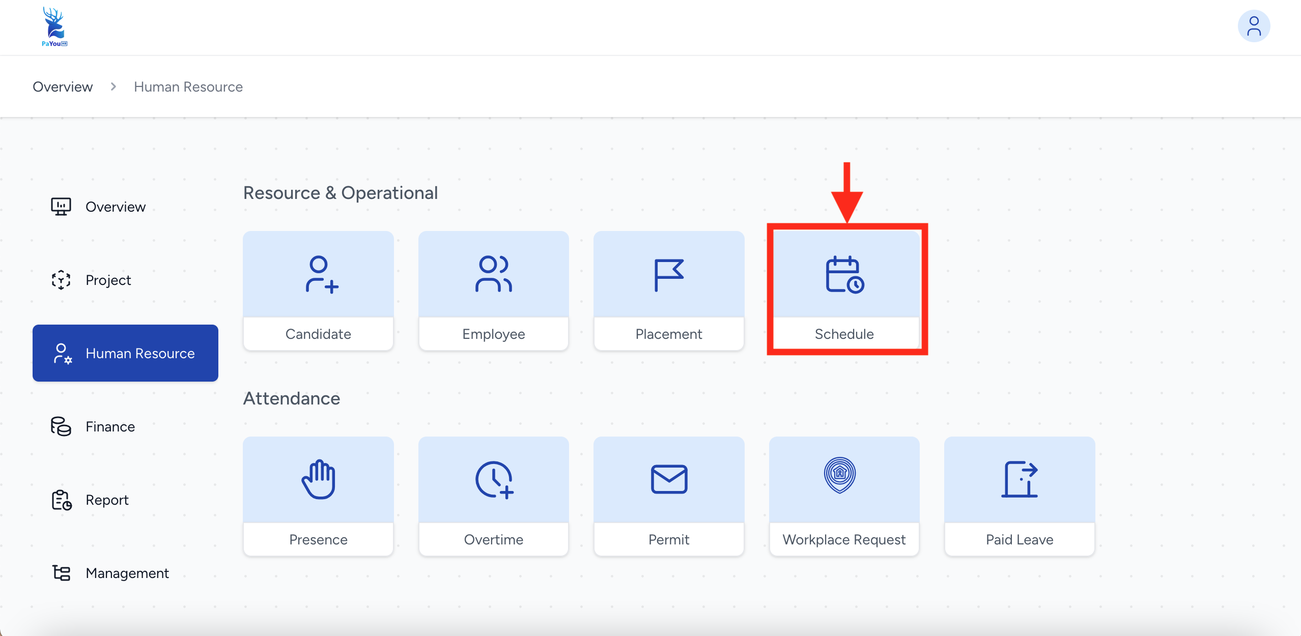 Di dalam kategori Resource & Operational, pilih kotak menu Schedule (ikon kalender) untuk mengelola jadwal kerja.