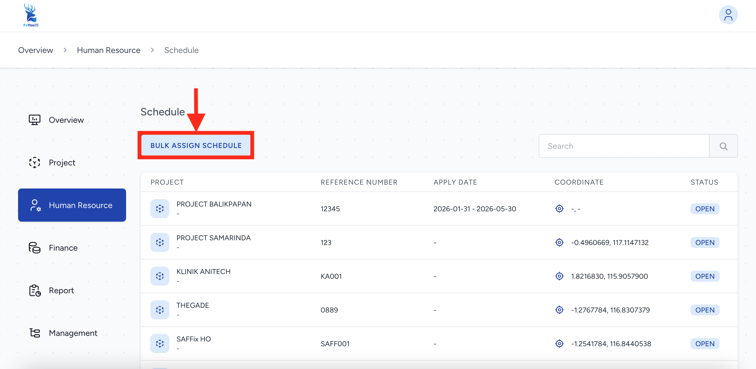 Di halaman daftar jadwal, klik tombol biru di bagian kiri atas yang bertuliskan BULK ASSIGN SCHEDULE.