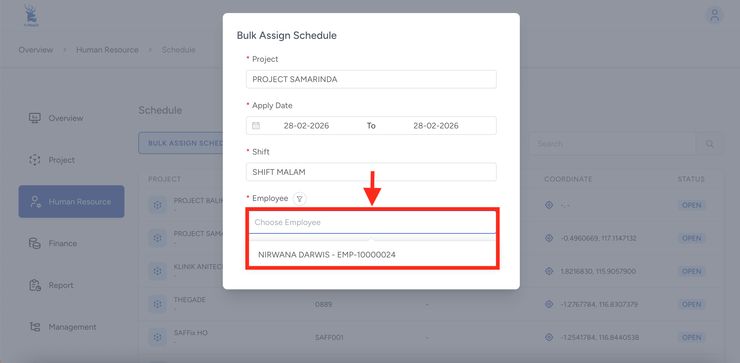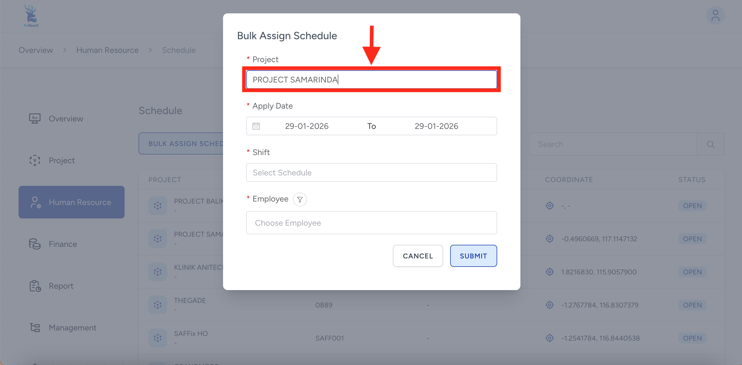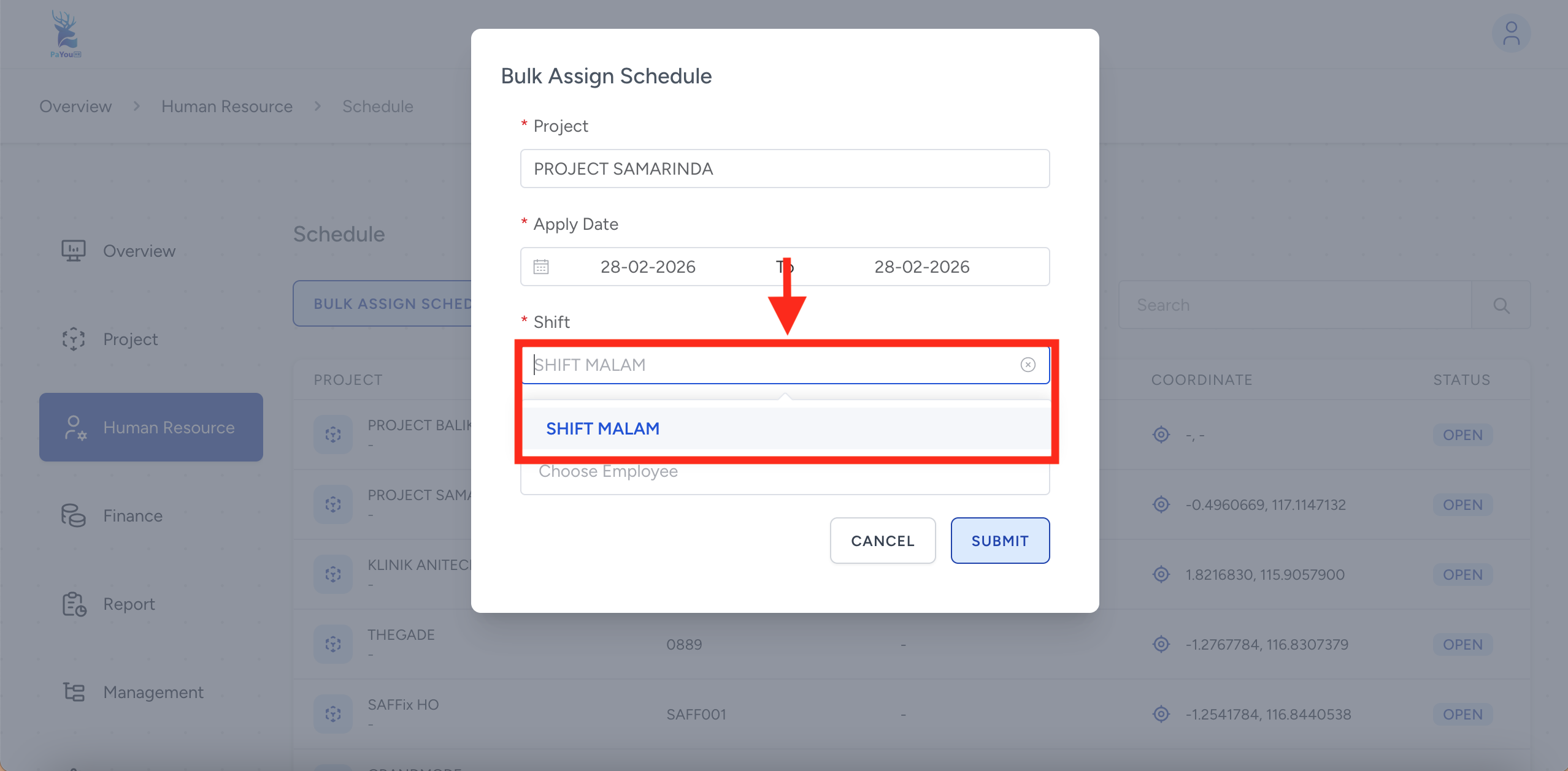 Klik kolom project, kemudian pilih project penempatan kerja yang akan di terapkan jadwal shift kerja.