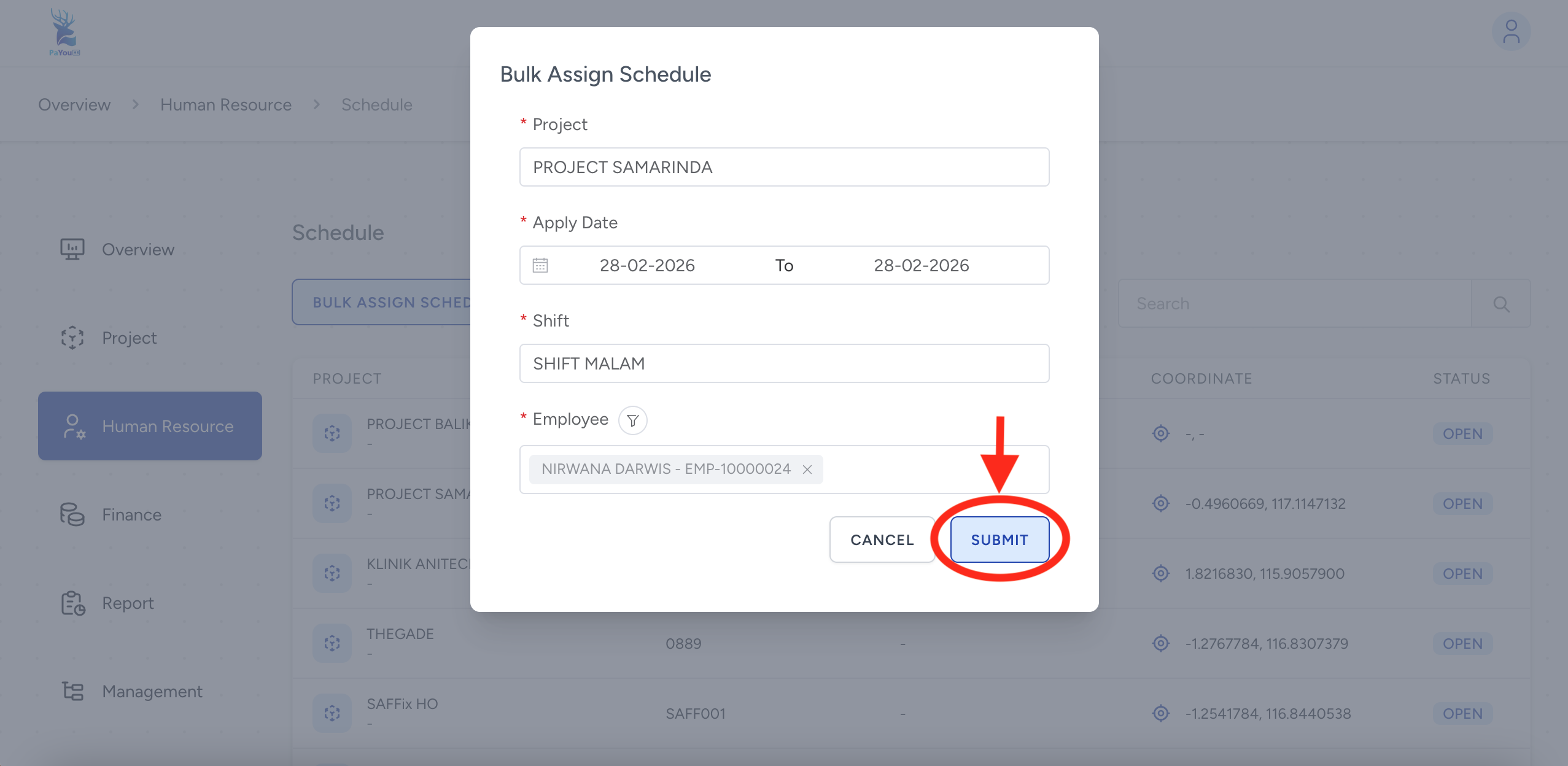 Pada kolom Employee, cari dan pilih nama karyawan yang akan ditugaskan (contoh: NIRWANA DARWIS). Terakhir, klik tombol SUBMIT untuk memproses jadwal tersebut.