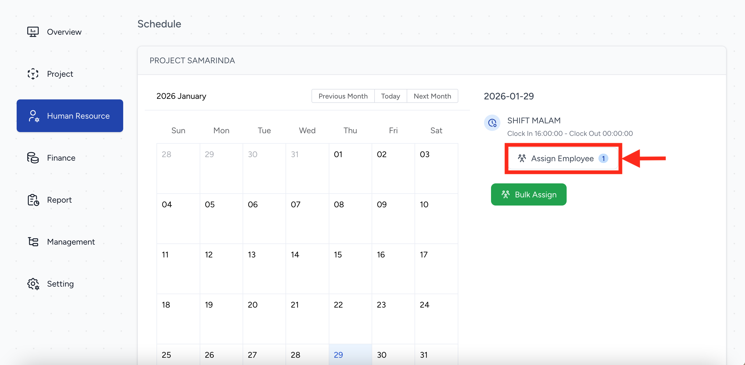 - Verifikasi Tanggal dan ShifCek Kalender: Setelah masuk ke halaman proyek, verifikasi tanggal pada kalender (contoh: 29 Januari 2026) untuk melihat shift yang tersedia kemudian ada panel sebelah kanan, Anda akan melihat detail shift seperti SHIFT MALAM beserta jam kerjanya. Klik tombol Assign Employee untuk melihat siapa karyawan yang di tugaskan pada project tersebut.