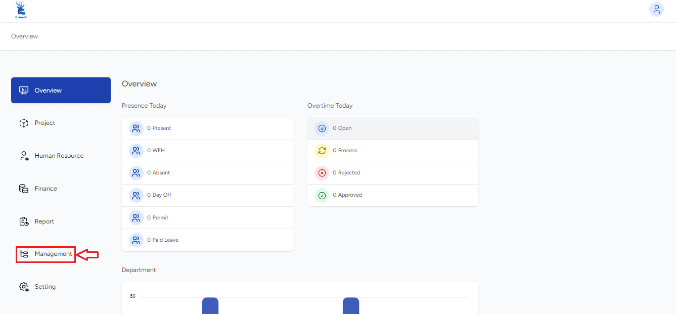 - Pilih menu Management pada sidebar kiri, yang berfungsi sebagai pusat kendali untuk mengatur struktur dan parameter master data perusahaan.