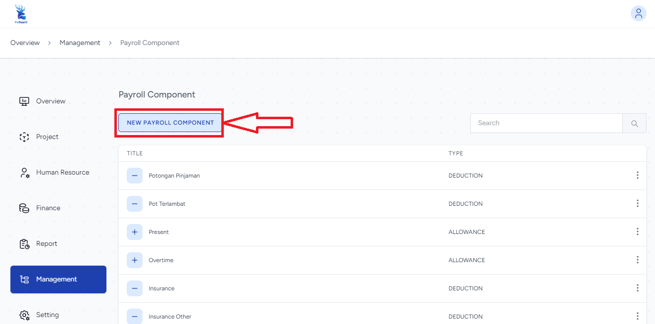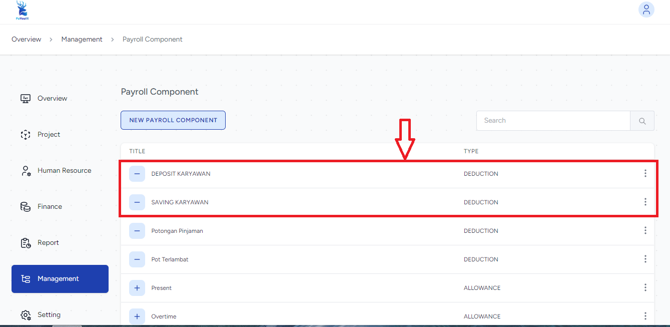 - Pada bagian Master di halaman Management, pilih Payroll Component untuk menentukan jenis tunjangan atau potongan (contoh: saving dan deposito) yang berlaku di perusahaan.