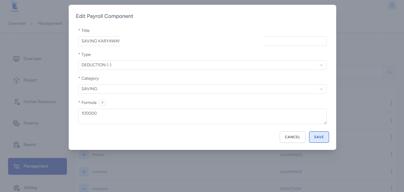 Untuk Saving (Simpanan): Isi kolom Title dengan 'SAVING KARYAWAN', pilih tipe DEDUCTION (-) dengan kategori SAVING, lalu masukkan angka nominal (misalnya 100000) pada kolom Formula, kemudian klik SAVE.
