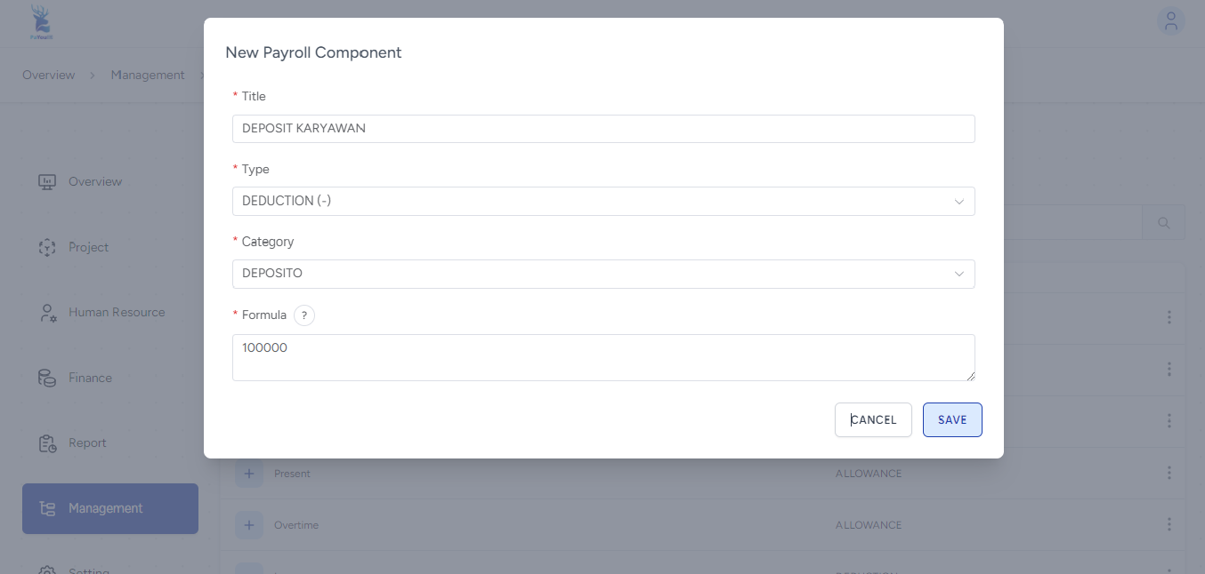 Untuk Deposit (Jaminan): Isi kolom Title dengan 'DEPOSIT KARYAWAN', pilih tipe DEDUCTION (-) dengan kategori DEPOSITO, lalu masukkan angka nominal (misalnya 100000) pada kolom Formula, kemudian klik SAVE.