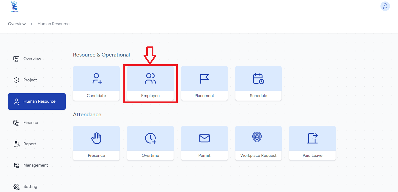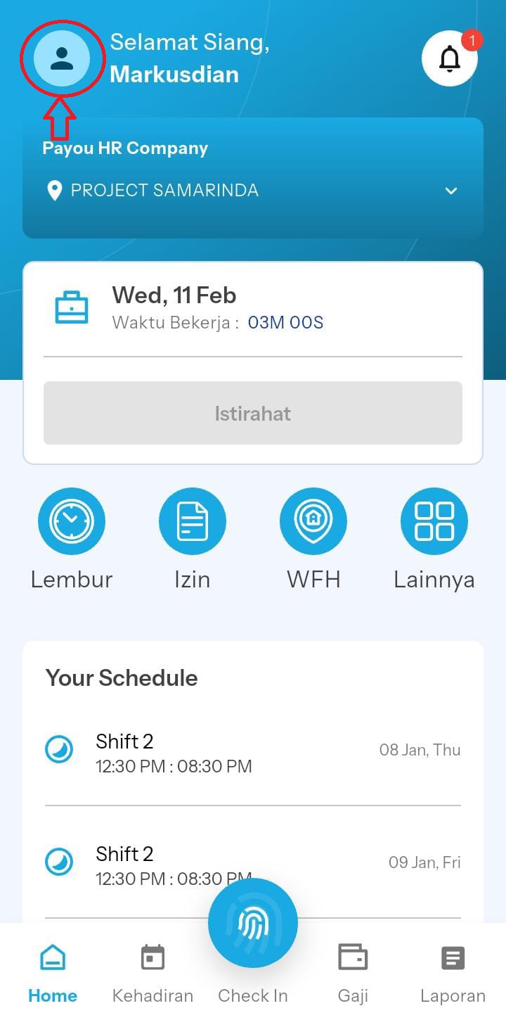 Masuk ke menu Dasboard di aplikasi mobile PaYou HR, Kemudian klik ikon Profile pada pojok kiri sebelah Atas.