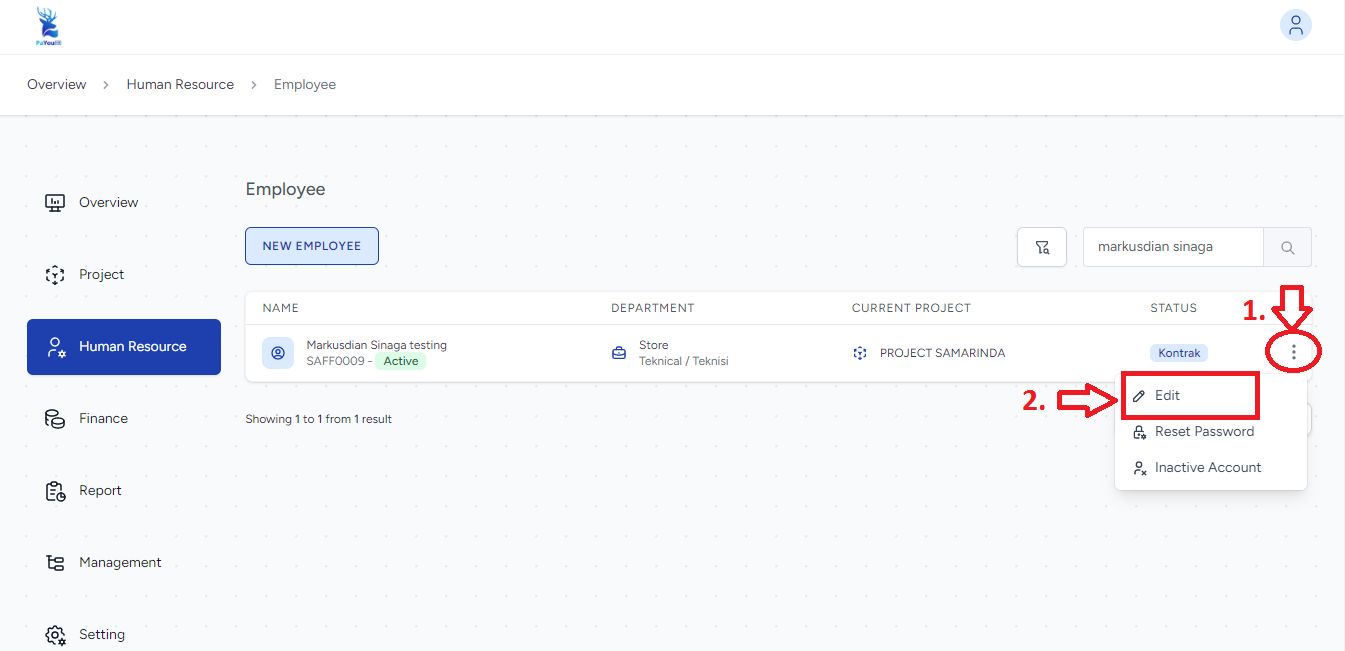 Klik ikon titik tiga (opsi) di sebelah kanan nama karyawan, lalu pilih menu Edit untuk menerapkan komponen payroll pada data karyawan tersebut.