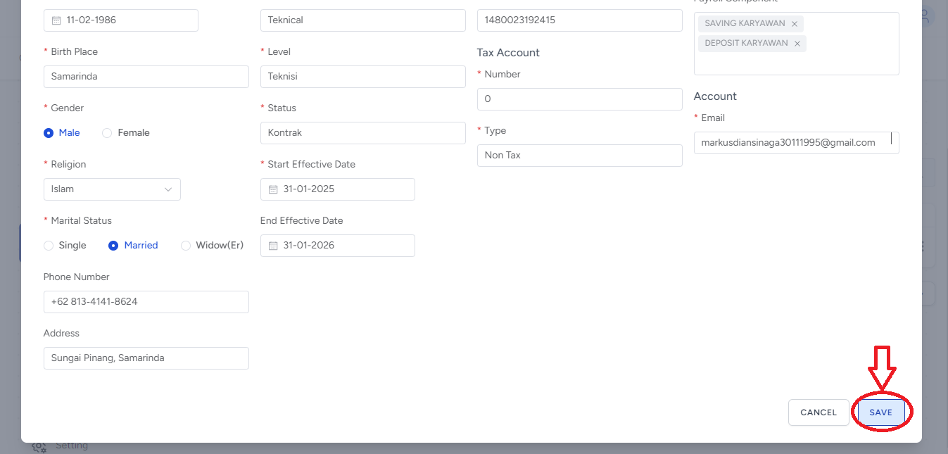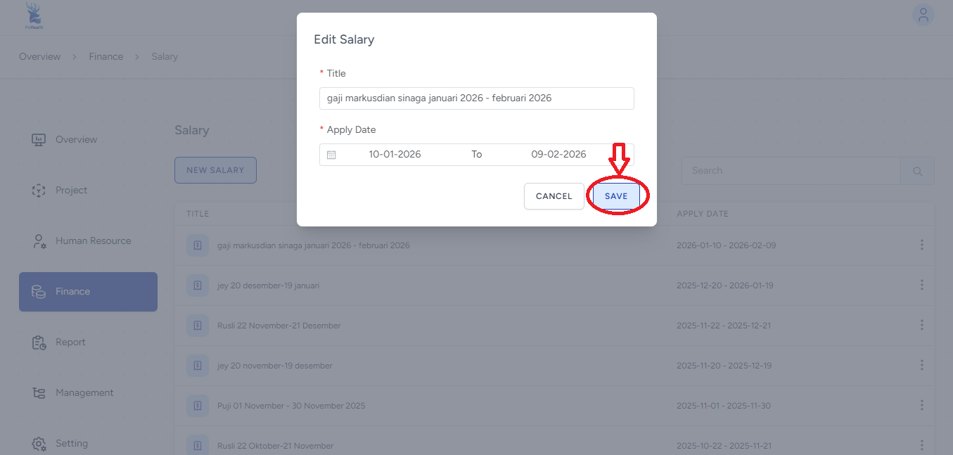 Masukkan nama karyawan dan periode bulan yang diinginkan (contoh: gaji markusdian sinaga Januari 2026 - Februari 2026), Kemudian klik SAVE.