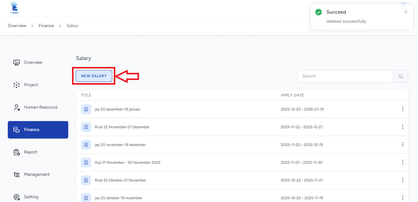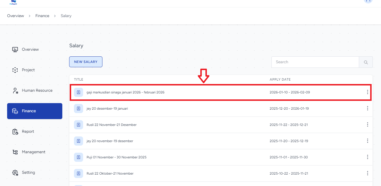 - Periode gaji yang baru saja dibuat akan otomatis muncul di baris paling atas pada daftar list Salary.