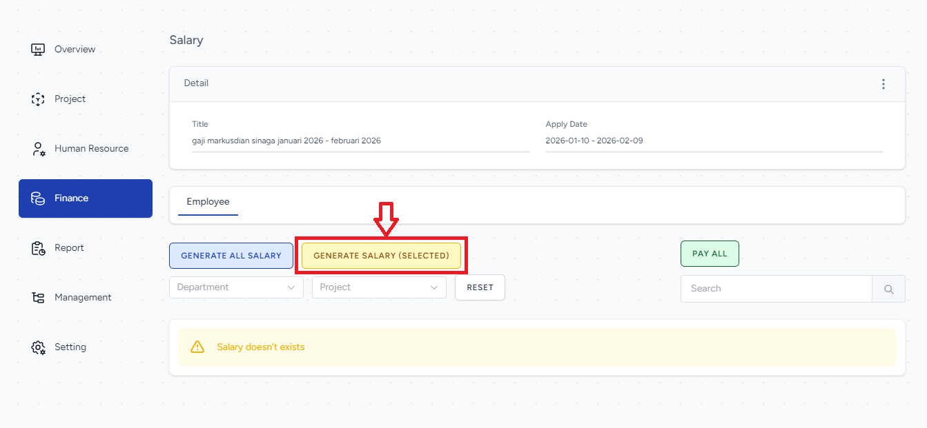 klik periode gaji karyawan yang bersangkutan, lalu klik tombol GENERATE SALARY (SELECTED)