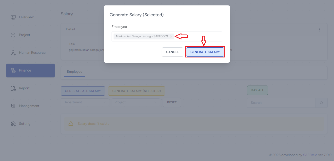 - pilih nama karyawan yang bersangkutan, lalu klik tombol GENERATE SALARY.