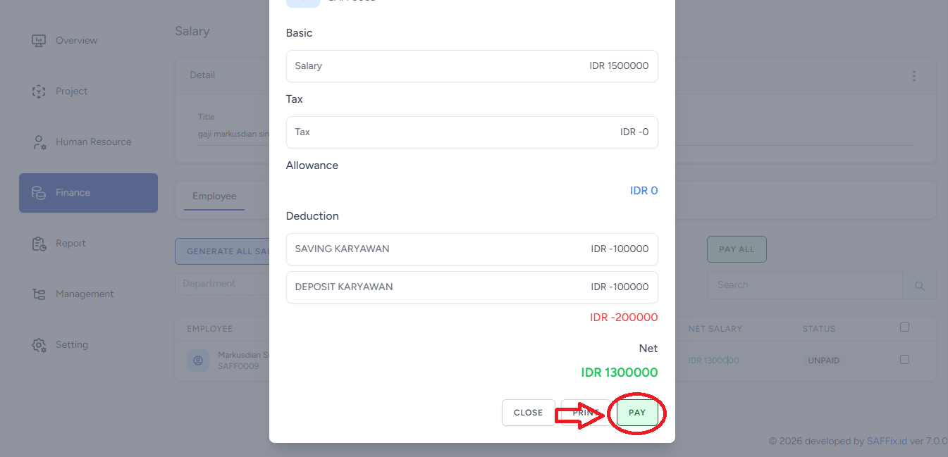 Sistem akan menampilkan rincian gaji, Pastikan pada bagian Deduction, item SAVING KARYAWAN dan DEPOSIT KARYAWAN sudah terhitung sebagai pengurang gaji, Jika sudah sesuai, klik PAY atau SAVE.