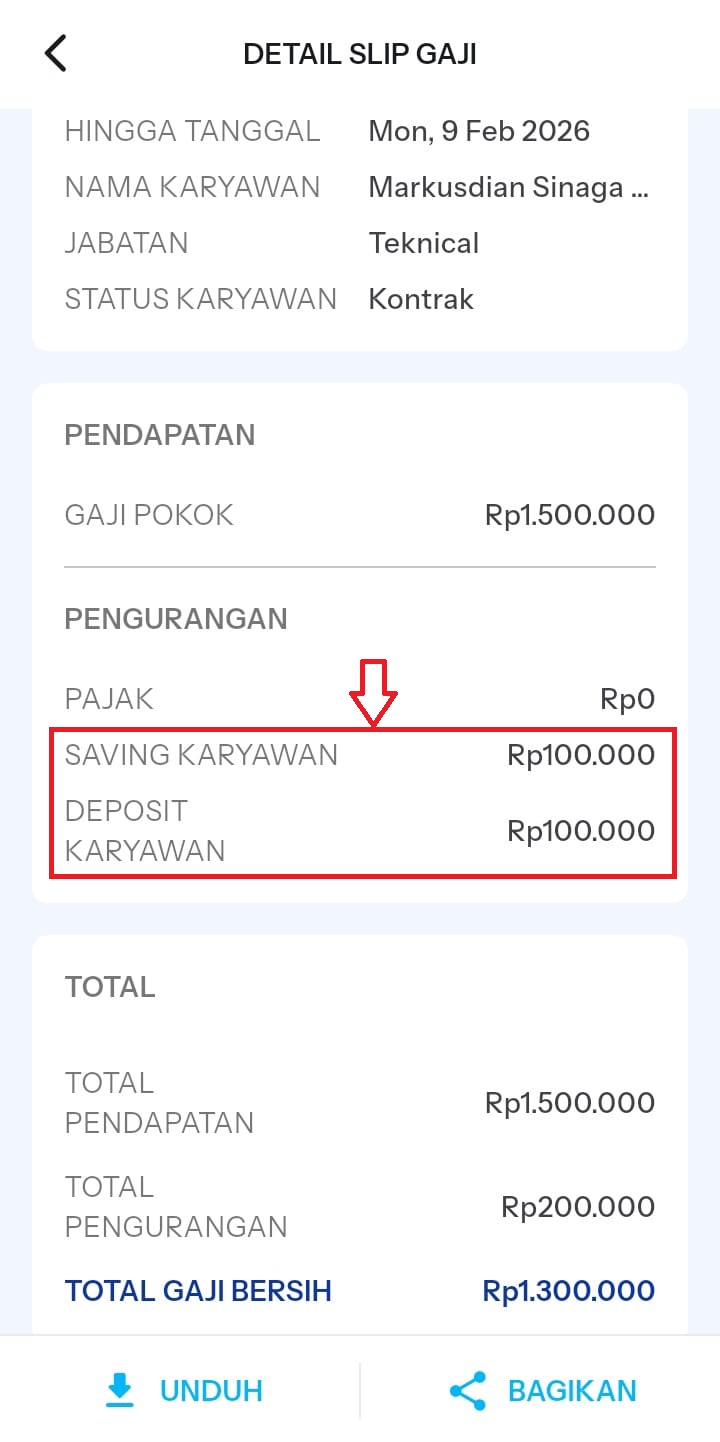 Di halaman utama aplikasi, buka menu Gaji pada bagian bawah sebelah kanan dan pilih periode slip gaji yang diinginkan untuk melihat rincian potongan SAVING KARYAWAN serta DEPOSIT KARYAWAN pada bagian Deduction (Pengurangan).